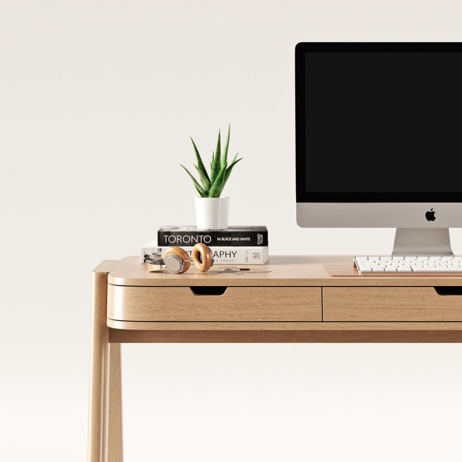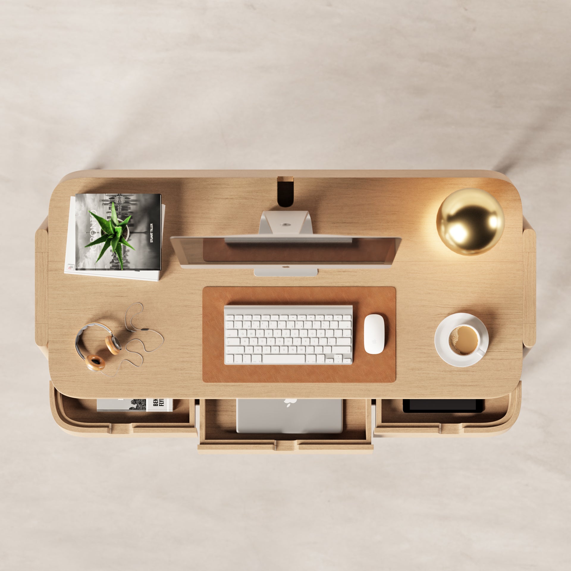 Its composition integrates three slim front drawers, proportioned to discreetly accommodate everyday devices such as tablets and laptops, while a rear drawer is dedicated to cable management, maintaining a clean and uninterrupted workspace.